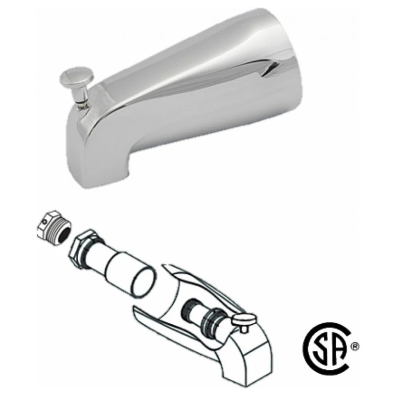 THIS PRODUCT INCLUDE(S): 1x tub spout in chrome color (34982). UNIVERSAL AND ADJUSTABLE DIVERTER TUB SPOUT. DIVERTER AT NOSE. CHROME PLATED. 0.5 COPPER- 0.625 OD AT REAR.0.5 FIP AT NOSE. 0.75 OR 0.5 FIP AT REAR WITH UP TO 1 INCH ADJUSTMENT. This tub spout features a spout shape with a modern style. This product is made for wall mount installation. DIY installation instructions are included in the box. This tub spout is made with stainless steel. The primary color of this product is chrome and it comes with chrome hardware. 5.38-in. Width (left to right). 2.75-in. Depth (back to front). 8.38-in. Height (top to bottom). All dimensions are nominal. This product can usually be shipped out in 1 day. Quality control approved in Canada. Each box on your order is physically opened-up and inspected to make sure only the highest quality product is shipped. We take and store photos of every single quality audit of every single order we ship. You can see them when you track your order on our website.