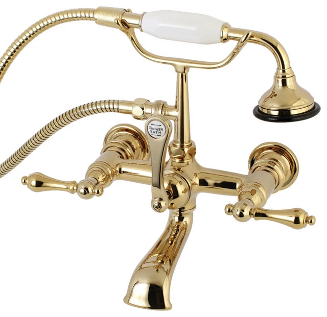 Kingston Brass AE551T2 Aqua Vintage 7-Inch Wall Mount Tub Faucet with Hand Shower, Polished BrassWall mount clawfoot tub faucets are the perfect fixture to add decorative flair within your bathroom because of their unique architectural elements. With vintage opulence, this will complete your refined bathroom decorum with the help of its premium polished brass finish and traditionally styled handheld shower. The solid brass construction also makes for a heavy, quality made product.Product Dimension : 6.88″L x 7″W x 11.5″H, Item Weight (lbs) : 8.68