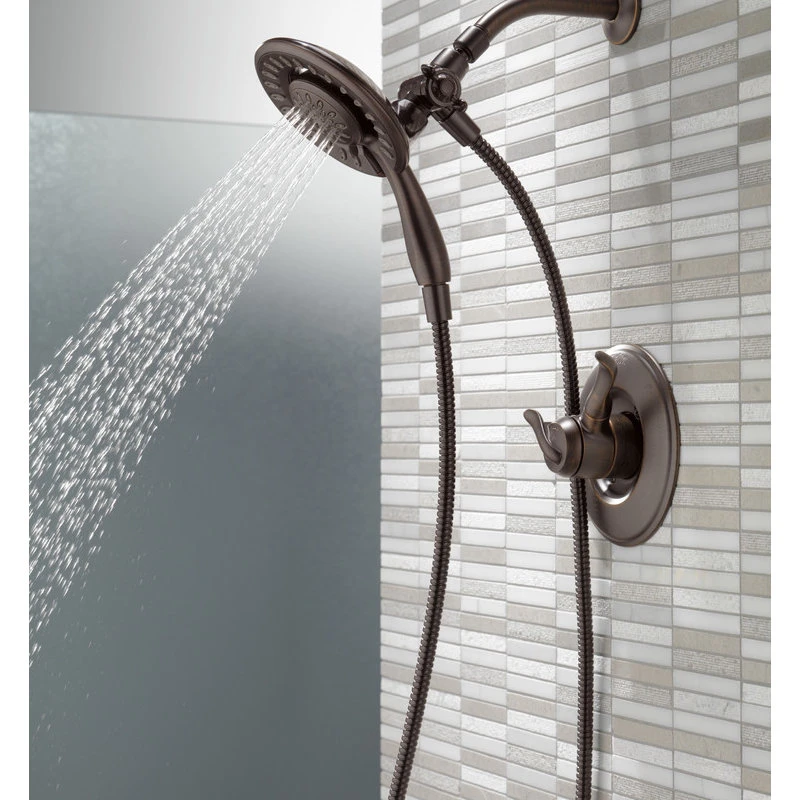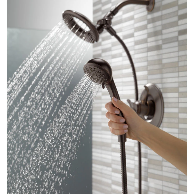 The Delta In2ition Two-in-One Shower features a detachable hand shower which can be used separately from or simultaneously with the shower head. This integrated dual-functionality gives you maximum flexibility without sacrificing warmth, as you can choose to have water streaming from the shower head only, the hand shower only or both the shower head and hand shower at once. With separate handles for volume and temperature control, this Delta tub/shower provides a more refined showering experience. Simply set the water at your preferred temperature and turn the shower on or off with the volume control handle – without interrupting your set temperature. The pause setting gives you ample space for shaving, lathering and other shower tasks, then easily restarts the water with the temperature where you left off. This spray setting helps you conserve water, so you can worry less about depleting your supply of hot water – and you help the environment too. Delta pressure-balance valves use Monitor Technology to protect you and your family from sudden temperature changes. An ornate blend of deep, warm tones and subtle highlights give Venetian Bronze a hand-brushed look that can transform a bath. Offering a smooth contrast to light tones and coordinating well with darker ones, this finish can have a beautiful soothing effect on almost any space. Delta WaterSense labeled faucets, showers and toilets use at least 20% less water than the industry standard�saving you money without compromising performance.