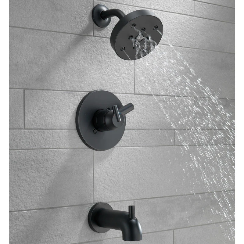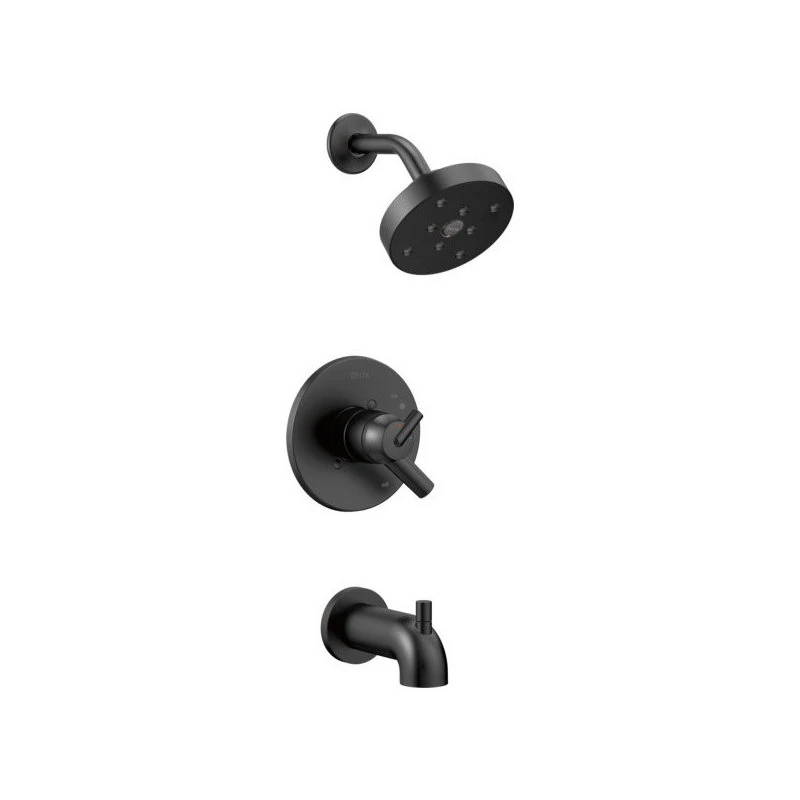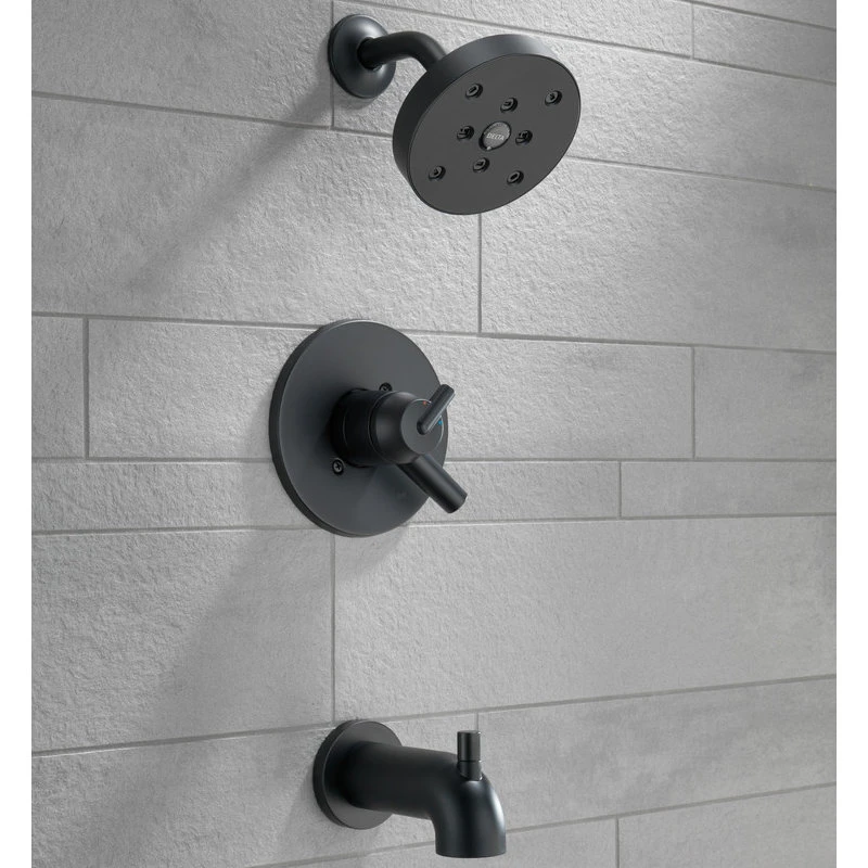 Inspired by the sleek elegance of modern European design, the Trinsic Bath Collection completes the look of any contemporary bath, from classic to rustic. Delta H2Okinetic Showers look different because they are different. Using advanced technology, H2Okinetic showers sculpt water into a unique wave pattern, giving you 3X the coverage of a standard shower head.* The end result is a shower that provides more coverage, more warmth and more intensity for a truly drenching shower experience. With separate handles for volume and temperature control, this Delta tub/shower provides a more refined showering experience. Simply set the water at your preferred temperature and turn the shower on or off with the volume control handle – without interrupting your set temperature. Delta pressure-balance valves use Monitor Technology to protect you and your family from sudden temperature changes. Matte Black makes a statement in your space, cultivating a sophisticated air and coordinating flawlessly with most other fixtures and accents. With bright tones, Matte Black is undeniably modern with a strong contrast, but it can complement traditional or transitional spaces just as well when paired against warm nuetrals for a rustic feel akin to cast iron. Delta WaterSense labeled faucets, showers and toilets use at least 20% less water than the industry standard saving you money without compromising performance.