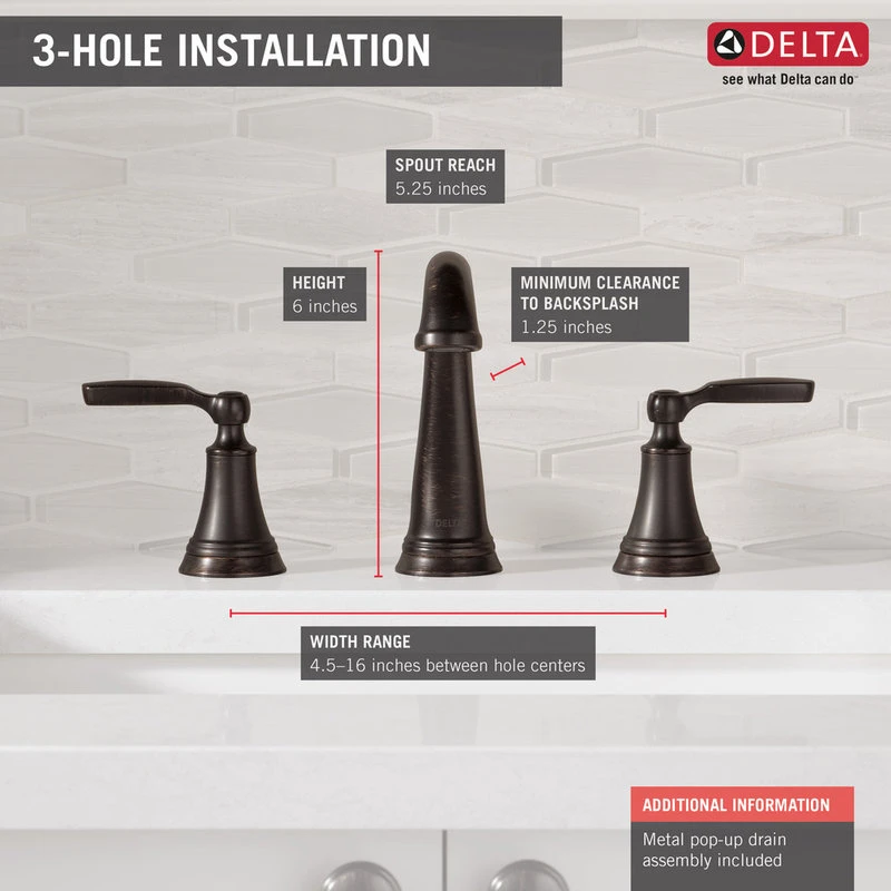 The Woodhurst Bath Collection’s refined style lends an alluring charm to your bath, while the button-cap detailing confers a classic familiarity. You can install with confidence, knowing that Delta faucets are backed by our Lifetime Limited Warranty. Delta WaterSense labeled faucets and showers use at least 20% less water than the industry standard saving you money without compromising performance.