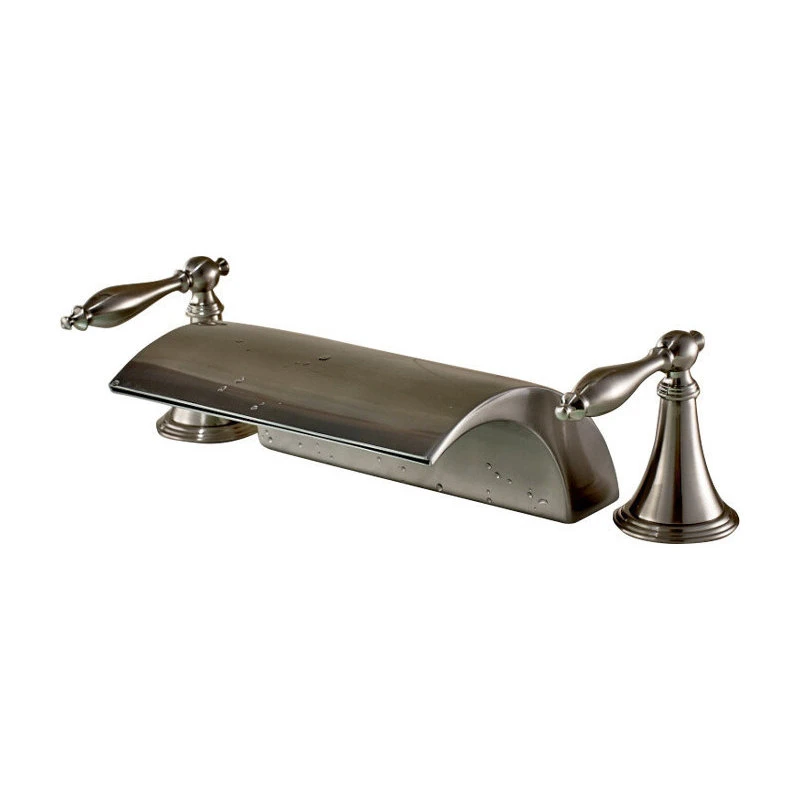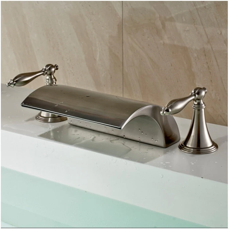 This wide spout waterfall bathtub faucet is perfect for contemporary bathrooms with an elegant style. The design makes the water look alive and the brushed nickel finish makes it easy to match with the other bathroom fixtures. It comes with hot and cold water mixer for your convenience. It is deck mounted, three holes, with brushed nickel finish. The body, spout and handles are made of brass, while the valve core material is ceramic for best performance and long lasting life time. It comes complete with accessories and installation instructions.