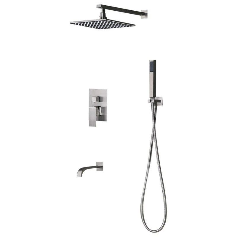 With the ultra-contemporary styling, Dree Faucet Collection features 90 Degree that brings a clean, minimalist aesthetic appeal to your home. Featuring a square rain shower head, this shower system from Dree Collection provides luxurious shower experience, soothing, refreshing enjoyment. Equipped with the hand shower kit, it offers extended reach, maneuverability to aim the water to your skin, complement your rinsing needs., a tub spout fixing at the bottom, makes the filling of a tub, washing of feet, pets a breeze. Coated in a refined brushed nickel finish, it will add a simple, yet upscale look to your bathroom.