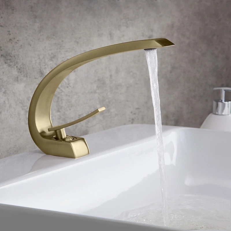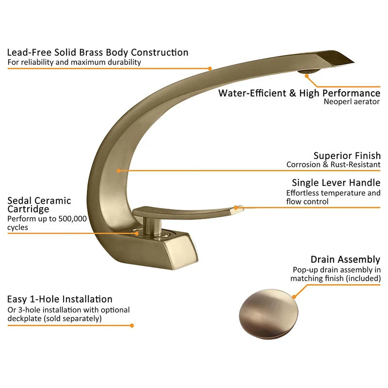 For a touch of artistic appeal and taste, this modern bathroom 1-hole sink faucet is second to none. Boasting a curvaceous arc design with clean lines and smoothly rounded edges, this unique faucet will add a fresh, new look with contemporary appeal to your bathroom. With a flat handle, it offers easy, precise control on hot and cold water flow. Made of solid brass construction and plated in premium finish, it resists corrosion and tarnishing for an everlasting sheen and beauty. A captivating addition that takes your bathroom to the next level.