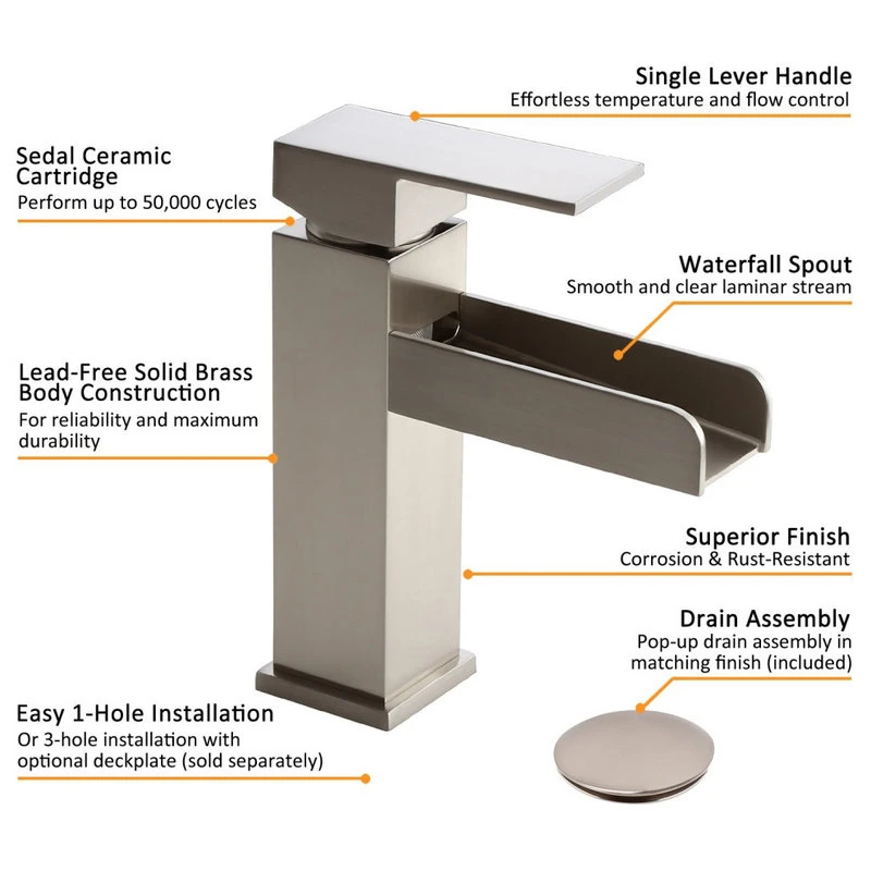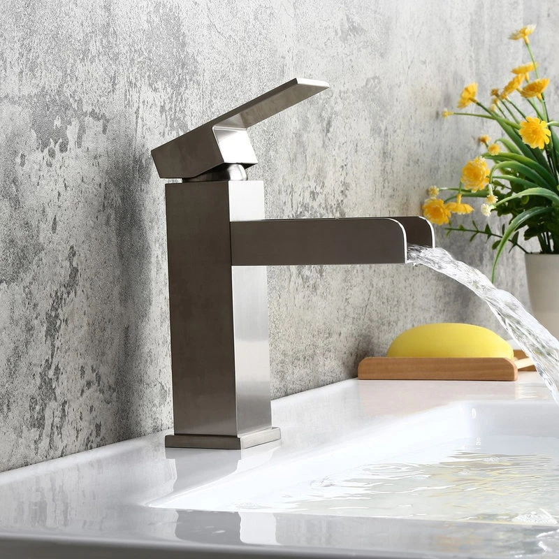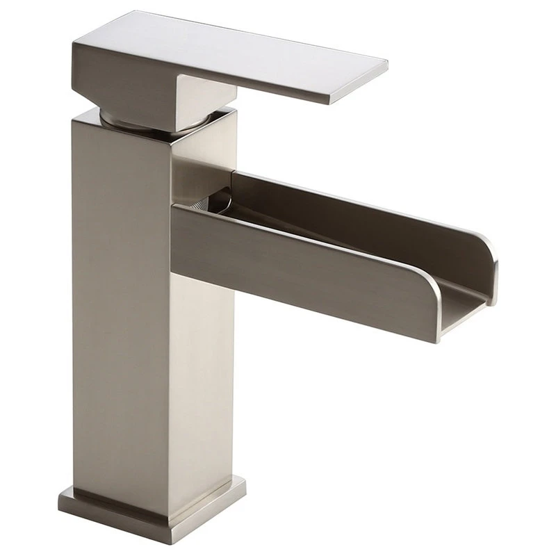 Chic style meets clean design to create this modern, minimalist bathroom sink faucet. It features crisp lines and right angles throughout the simple square body to suit hospitality or residential settings flawlessly. With a long trough spout, it sends water cascading down into the sink and makes a beautiful waterfall statement. Boasting a flat handle atop the body, it is a breeze to adjust the water flow and temperature precisely. Made from solid brass in superior finish, this sink faucet is a durable and attractive piece to renew your bathroom with contemporary appeal.