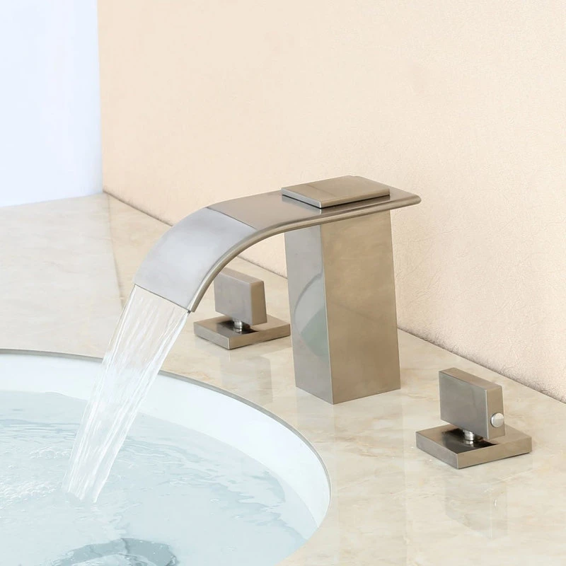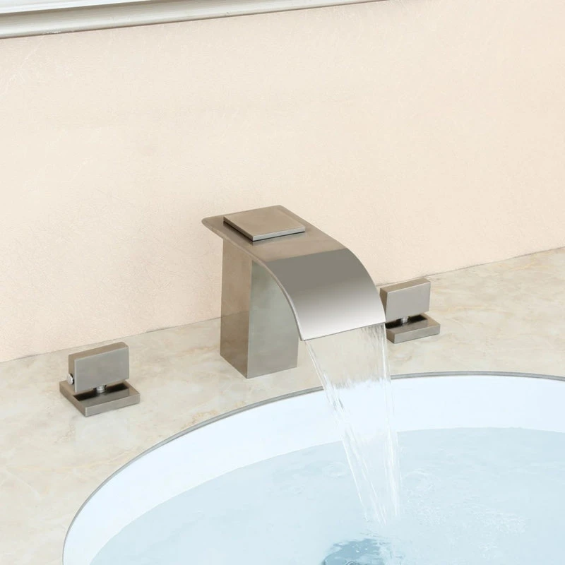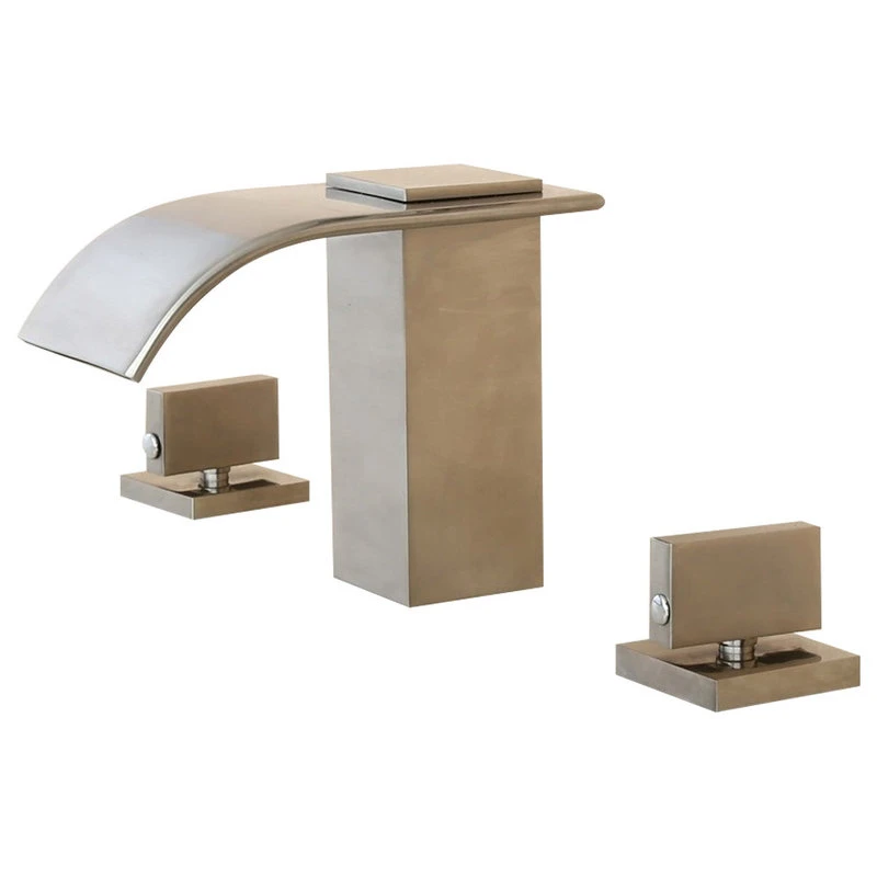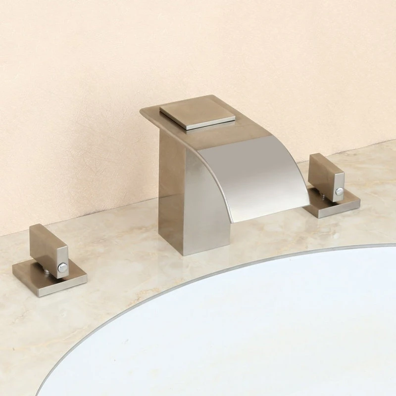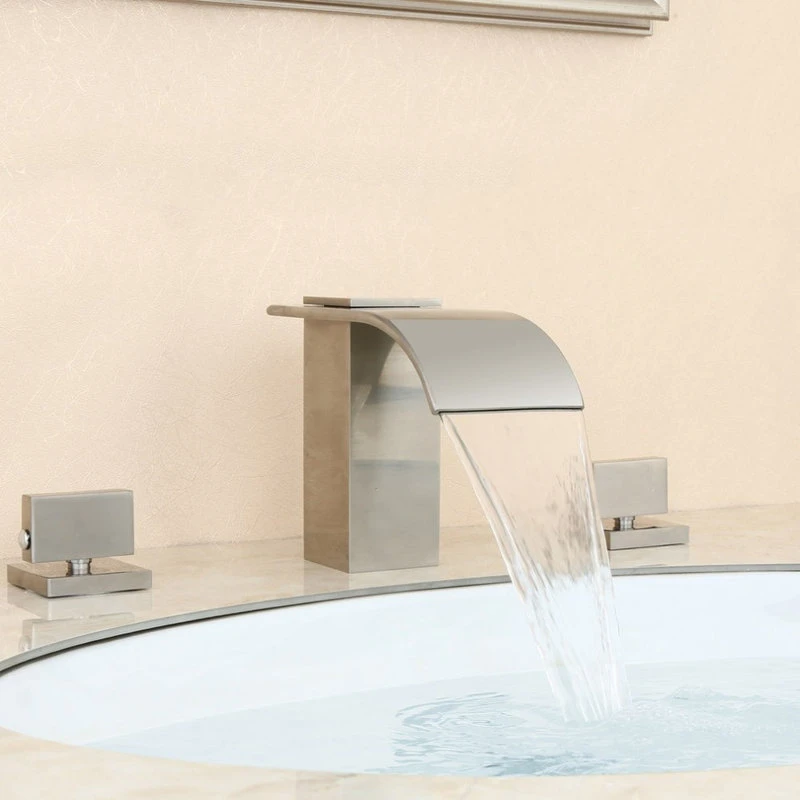Milly Waterfall Faucet is designed to bring a modern and fun feel into any room. From Milly Collection comes this widespread sink faucet for your bathroom. It brings together clean crispness and smooth, sleek curve for an impressive modern touch and embraces a beautiful symmetry to accentuate a variety of styles. Come with double knob design and waterfall spout, it delivers a pleasing performance with an easy, accurate finger control.Chosse the brushed nickel finish to match your personal taste.