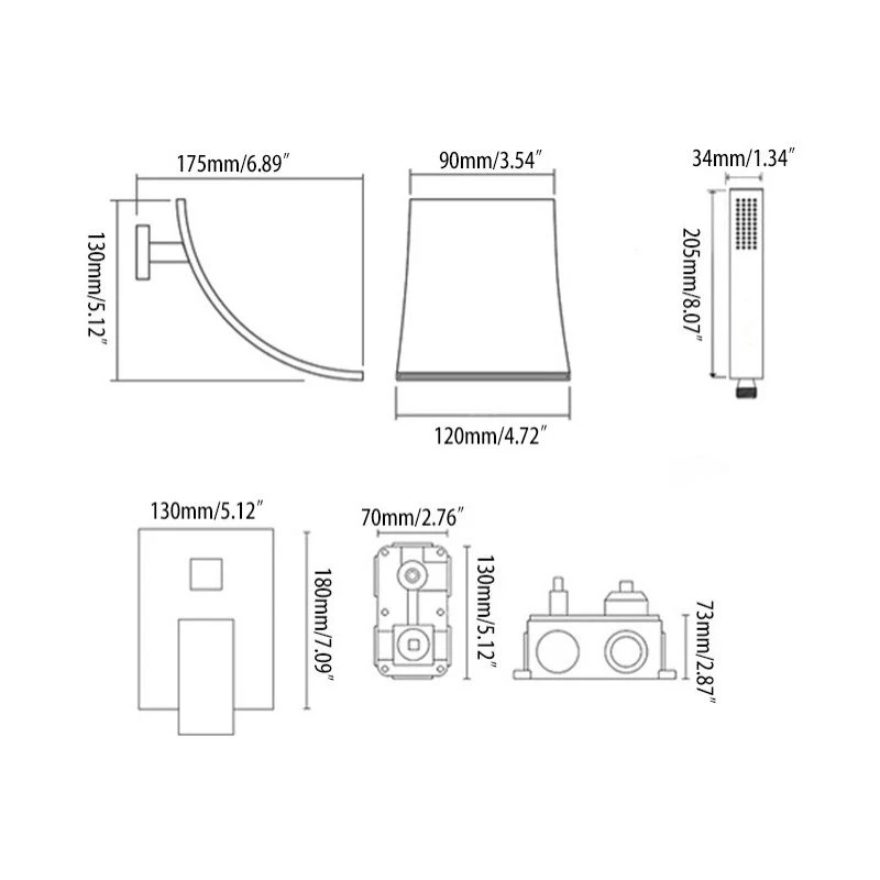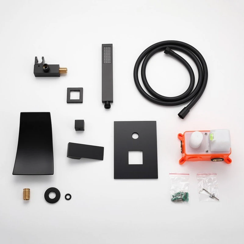 - Included Components: faucet spout, hand shower, handshower holder, mounting hardware, rough-in box, shower hose