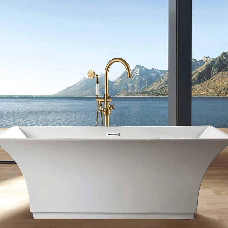 This freestyle bathtub faucet is made of brass.It includes a shower hose and hand shower with a advanced valves.This modern stand-alone bathtub faucet adjusts the water temperature to avoid sudden hot and cold shocks. The modern design of this floor mounted bathroom faucet is intended to subtly complement your contemporary bathroom, adding more elegance to your bathroom. Hand Shower with shower hose, perfect for full body shower or cleaning the tub. Each faucet is with a finish that resists tarnishing, corrosion, and mineral buildup. That’s a good choice for your home improvement.