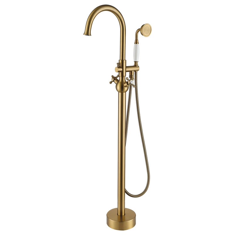 Jims Maison Freestanding Cross Double Handle High Arc Bathtub Faucet With Shower Hose, Gold