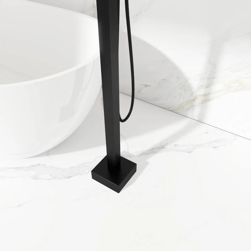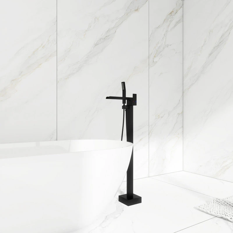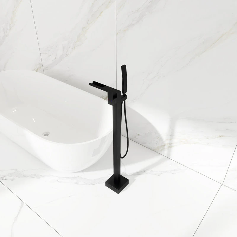 With an elegant waterfall spout design, this floor mounted tub filler faucet with a matte black finish. Pretty and practical, this bathtub faucet pairs well with nearly all modern bathroom designs and brings a fashion statement. With its single handle water control, it provides for minimalist appearance and simple daily use.