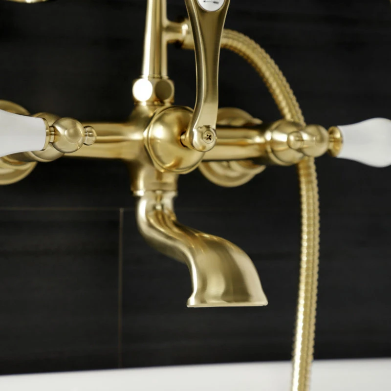 Wall mount clawfoot tub faucets are the perfect fixture to add decorative flair within your bathroom because of their unique architectural elements. With vintage opulence, this will complete your refined bathroom decorum with the help of its premium brushed brass finish and traditionally styled handheld shower. The solid brass construction also makes for a heavy, quality made product.