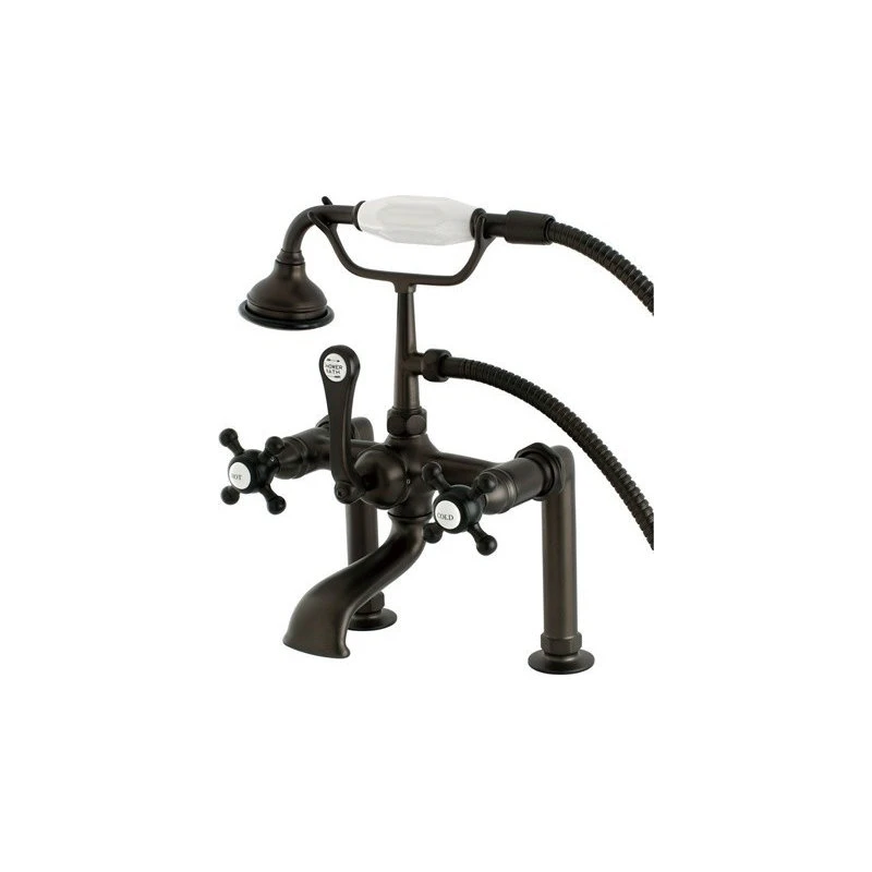 The English Country deck-mount bathtub faucet is a refined addition to complete the look of your vintage clawfoot bathtub. Manufactured from solid brass, this sturdy bath faucet comes in your choice of 4 finishes: Polished Chrome, Polished Brass, Oil Rubbed Bronze or Satin Nickel. With a classic hand shower and premier English Country cross handles, this tub faucet will offers years of enjoyment and beauty.