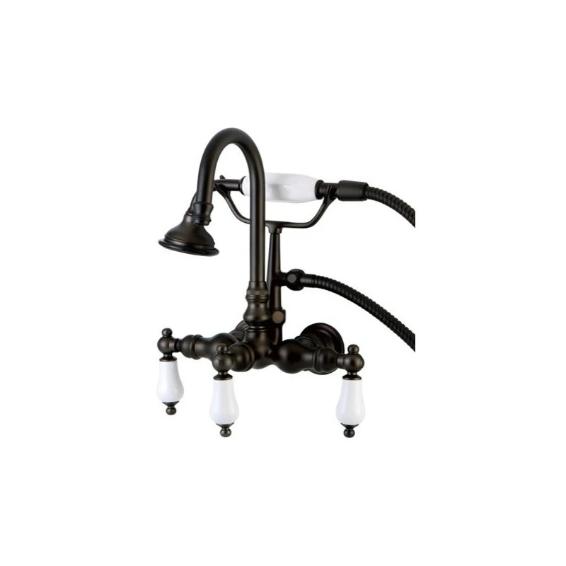 The Vintage wall mount bathtub filler provides vintage looks combined with outstanding performance and durability. With 3 easy to operate porcelain lever handles, this clawfoot tub faucet features a high arc “J” spout and a traditional telephone style hand shower. Complete the look of your clawfoot tub with this faucet which installs on 3-3/8″ centers on the wall of the tub. Available in 4 tarnish and corrosion resistant finishes: Polished Chrome, Polished Brass, Oil Rubbed Bronze or Satin Nickel.