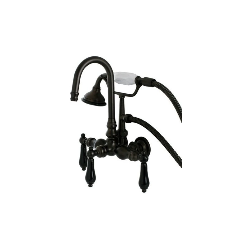 The Restoration Onyx wall mount bathtub filler provides vintage looks combined with outstanding performance and durability. With thee black porcelain lever handles, this clawfoot tub faucet features a high arc “J” spout and a traditional telephone style hand shower. Complete the look of your clawfoot tub with this faucet which installs on 3-3/8″ centers on the wall of the tub. Available in 4 tarnish and corrosion resistant finishes: Polished Chrome, Polished Brass, Oil Rubbed Bronze or Satin Nickel.