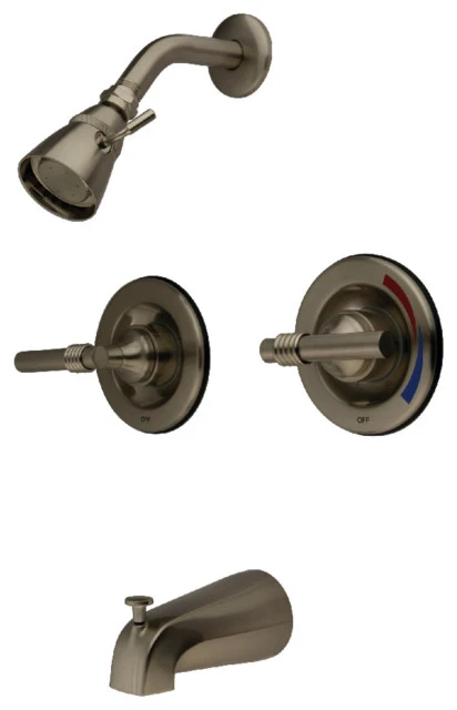 The twin-handle tub and shower faucet features a stylish contemporary style design. The shower includes two cylindrical metal levers gracefully constructed used for water temperature and control. Made in high quality brass, the faucet is built to be tarnish-free and corrosion-free.