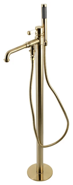 Distinguished for their stately configuration and artsy architecture, freestanding tub faucets are the perfect fixture for any contemporary home to both complement a freestanding tub and act as a beautiful ornamental piece in your bathroom. As the perfect accompaniment to your tub, the Paris freestanding tub faucet with hand shower will surely complete your refined bathroom decorum with the help of its premium, glistening brushed brass finish and hand shower. The brass and zinc alloy construction also makes for a heavy, quality made product.