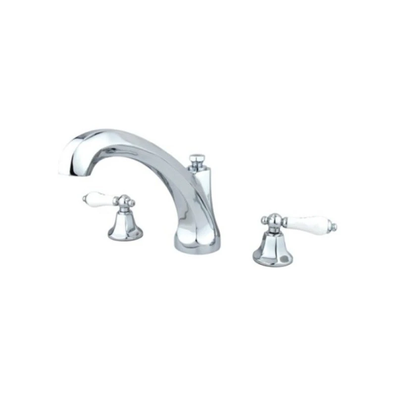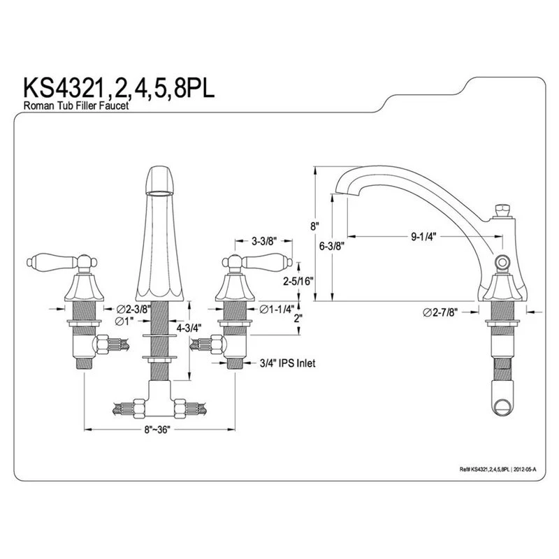 Solid brass construction for durability and reliability, Premium color finish resists tarnishing and corrosion, 13.0 GPM at 60 PSI, 9 1/4″ spout reach, 6 3/8″ spout height, 6 3/8″ spout clearance, 3/4″-14NPS, 1/4 turn ceramic disc cartridge, 8″-36″ widespread installation, Ten year limited warranty.. Manufacturer: Kingston Brass. Model: KS4321PL. UPC: 663370117138. Product Name: Kingston Brass Metropolitan Roman Tub Filler with Porcelain Lever Handles. Collection / Series: Metropolitan. Finish: Polished Chrome. Theme: Contemporary / Modern. Material: Brass. Type: Faucet. Features: Drip-free ceramic cartridge