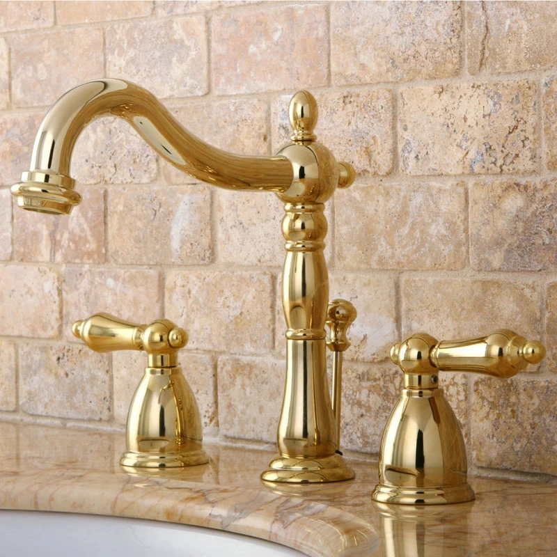 The Heritage Widespread Lavatory Faucet will bring elegance and function transforming any bathroom with its traditional styling and quality build. The Victorian style spout features a long 6-1/2″ spout reach and 5-3/16″ spout clearance. The classic lever handles on this faucet easily control water temperature and volume and choose from several different styles of handles to match any decor. Premier finish will resist corrosion and tarnishing and is available in polished chrome, polished brass, oil rubbed bronze, and satin nickel. Solid brass construction for excellent durability and performance and retail pop-up drain is included.