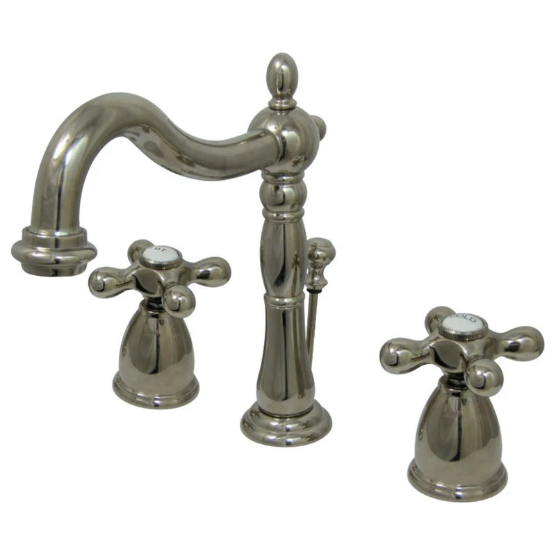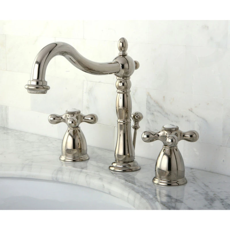 The Heritage Widespread Lavatory Faucet will bring elegance and function transforming any bathroom with its traditional styling and quality build. The Victorian style spout features a long 6-1/2″ spout reach and 5-3/16″ spout clearance. The classic cross handles on this faucet easily control water temperature and volume and choose from several different styles of handles to match any decor. Premier finish will resist corrosion and tarnishing and is available in polished chrome, polished brass, oil rubbed bronze, and satin nickel. Solid brass construction for excellent durability and performance and retail pop-up drain is included.
