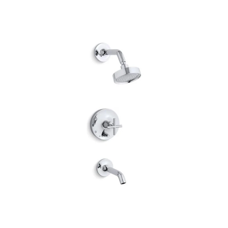 Purist faucets and accessories combine simple, architectural forms with sensual design lines. Featuring this modern, minimalist style, the Purist bath and shower faucet trim creates a sophisticated, unified look in your shower with a cross handle, spout, and showerhead. Pair this trim with a Rite-Temp(R) pressure-balancing valve with push-button diverter, which maintains your desired water temperature during pressure fluctuations.