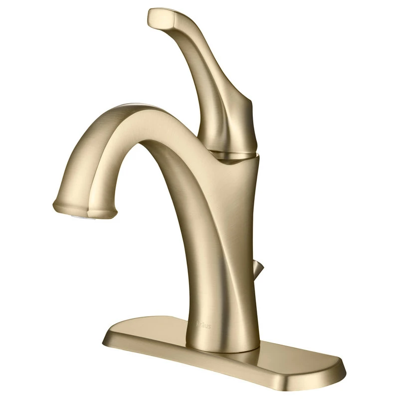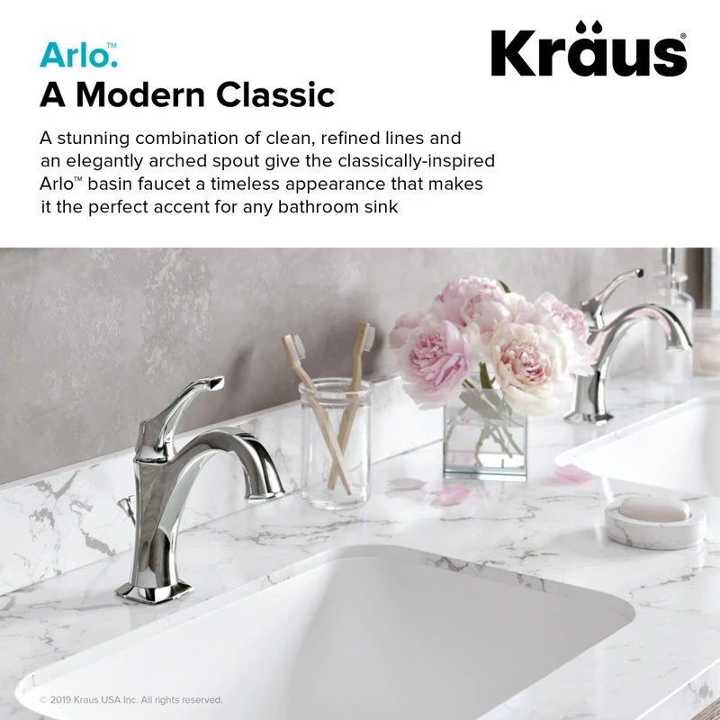 Add elegant style to any bathroom with the KRAUS Arlo basin faucet KBF-1201. A stunning combination of clean, refined lines and an arched spout give the classically-inspired Arlo basin faucet a timeless appearance. The gracefully curved single lever handle complements the shape of the spout, and allows you to easily adjust water temperature and volume. Featuring an eco-friendly aerator for maximum water savings, this faucet delivers up to 1.2 gallons per minute with a splash-free aerated stream. A KRAUS lift rod drain and deck plate in matching finish are included for convenient installation and a seamless look.