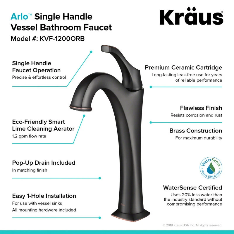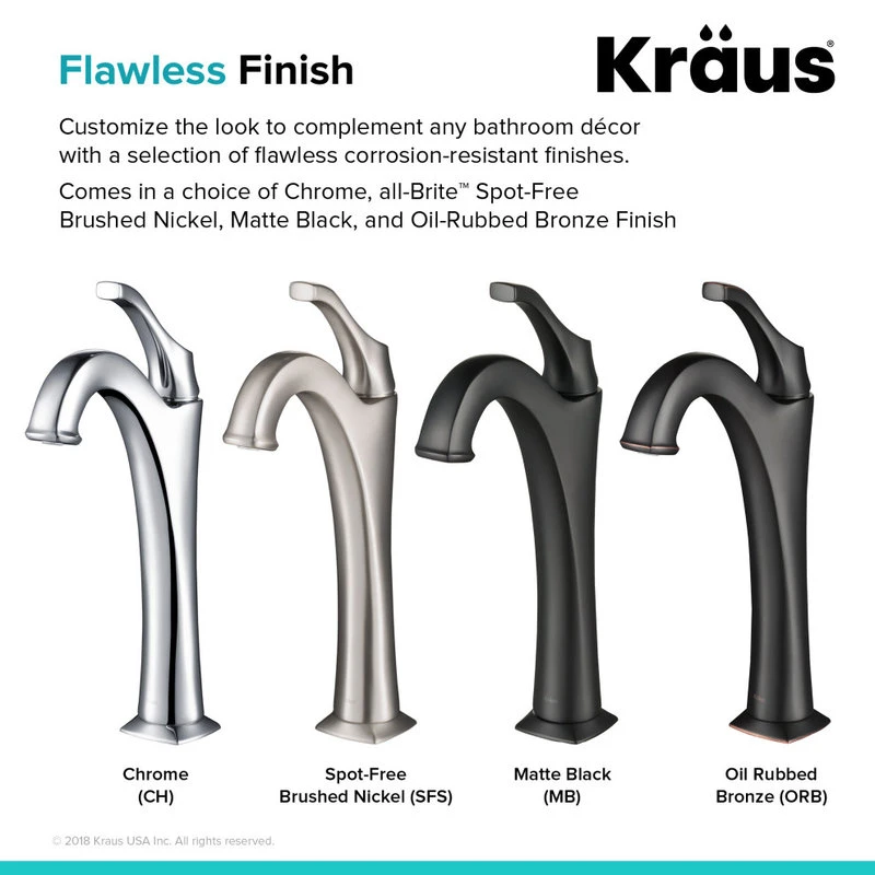Add elegant style to any bathroom with the KRAUS Arlo vessel faucet (KVF-1200SFS). A stunning combination of clean, refined lines and an arched spout give the classically-inspired design a timeless appearance. The gracefully curved single lever handle complements the shape of the spout, and allows you to easily adjust water temperature and volume. Featuring an eco-friendly aerator for maximum water savings, this faucet delivers up to 1.2 gallons per minute with a splash-free aerated stream. For a personalized look, Arlo comes in a choice of Spot-Free all-Brite Brushed Nickel, Chrome, Oil Rubbed Bronze, and Matte Black finish. A KRAUS pop-up drain in matching finish is included for convenient installation and a seamless look.
