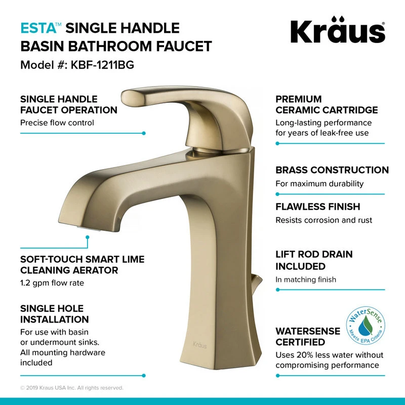 - Product: Kraus Esta Single Handle Bathroom Faucet with Lift Rod Drain