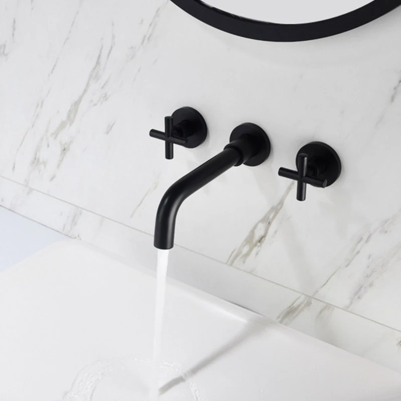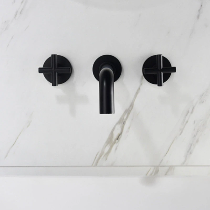 For a modern twist on a classic, the RENIST Wall-Mount Bathroom Faucet features cross handles designed with a cylindrical silhouette. This bold yet unassuming faucet is made of solid brass.