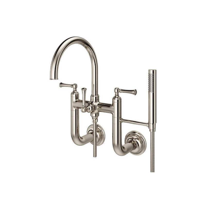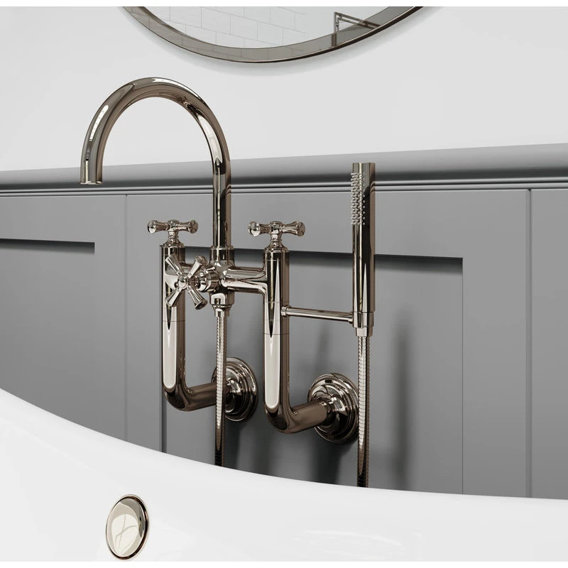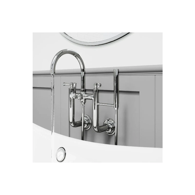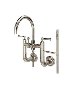 - Wall mounted tub filler – faucet mounts to the wall and extends to the tub fixture