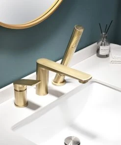 Modland Modern Dual Handle Wall Mounted Tub Spout With Handheld Shower, Brushed Gold
