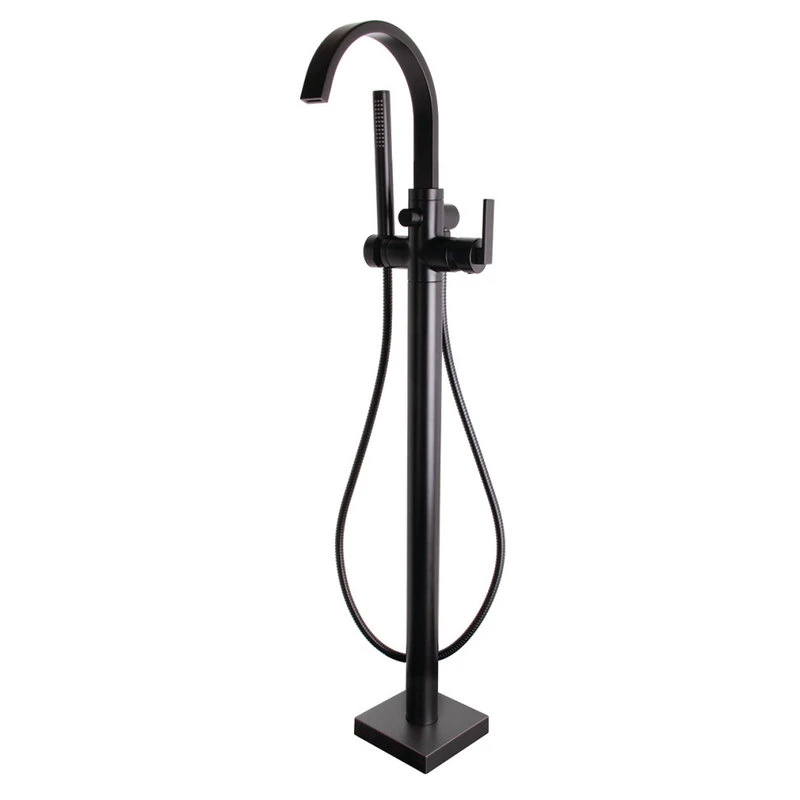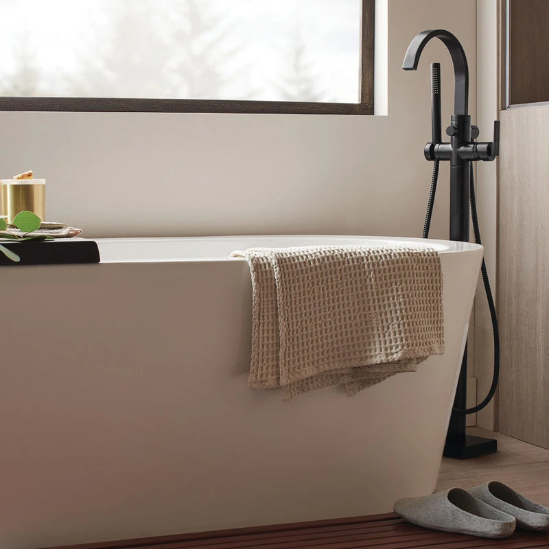 Crafted in partnership with award-winning designer Clodagh, the Lura Freestanding Roman Tub Faucet with Hand Shower marries elements of both modern and traditional design with seamless operation. It features a minimalistic spout paired with a singular lever handle and metal hand shower wand all housed on a stylized and sleek floor-installed unit. The solid, low-lead brass body is coated with a corrosion-resistant finish, assuring it maintains its matte black sheen over time.