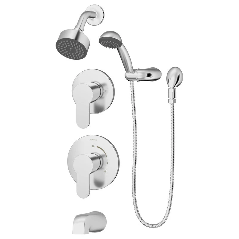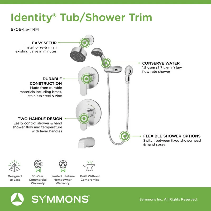 Part of the Symmons Identity Collection, this tub, shower, hand shower, and diverter trim kit includes a tub spout, shower arm, showerhead, hand shower with 60 inch flexible hose, a wall mount and wall elbow for the hand shower, escutcheons, and two lever handles. The single mode showerhead is WaterSense certified and has a low flow rate of 1.5 GPM, conserving water and saving you money on your water bill without affecting the shower’s performance. Like all Symmons products, this Identity trim kit is backed by a limited lifetime consumer warranty and 10 year commercial warranty.
