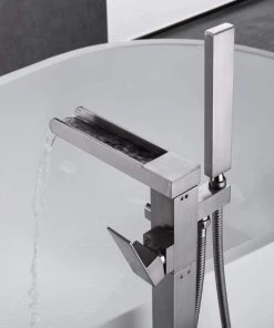 JimsMaison Single Handle Floor Mounted Freestanding Tub Filler With Hand Shower, Brushed Ni