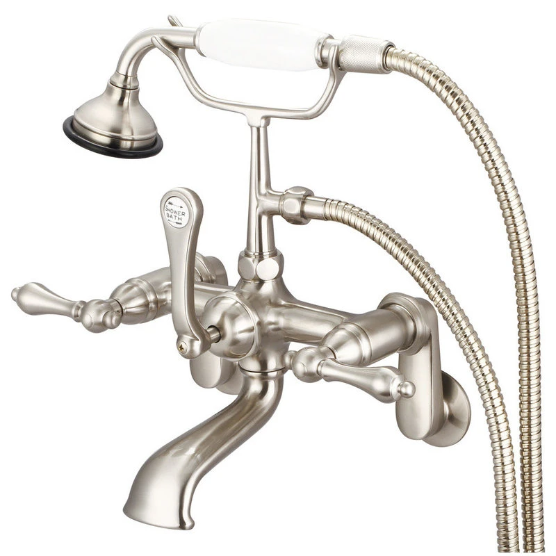 The brushed nickel Vintage Classic Bath and Handshower Faucet from Water Creation lends a regal appearance to a family bathroom. Its 60-inch matching finish hose allows easy reach to rinse off bath foam and can be coiled up on its hook when not in use. Featuring two lever-handled faucets, a water-flow lever and a wide spout, this wall-mounted brass fitting with porcelain accents completes a nostalgic look that complements a claw foot bathtub. Adhering to the highest quality standards and attention to detail, Water Creation is synonymous with timeless elegance.